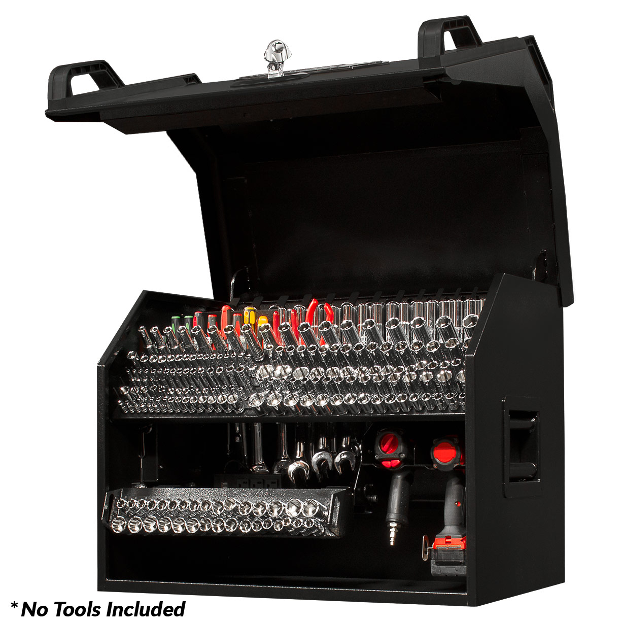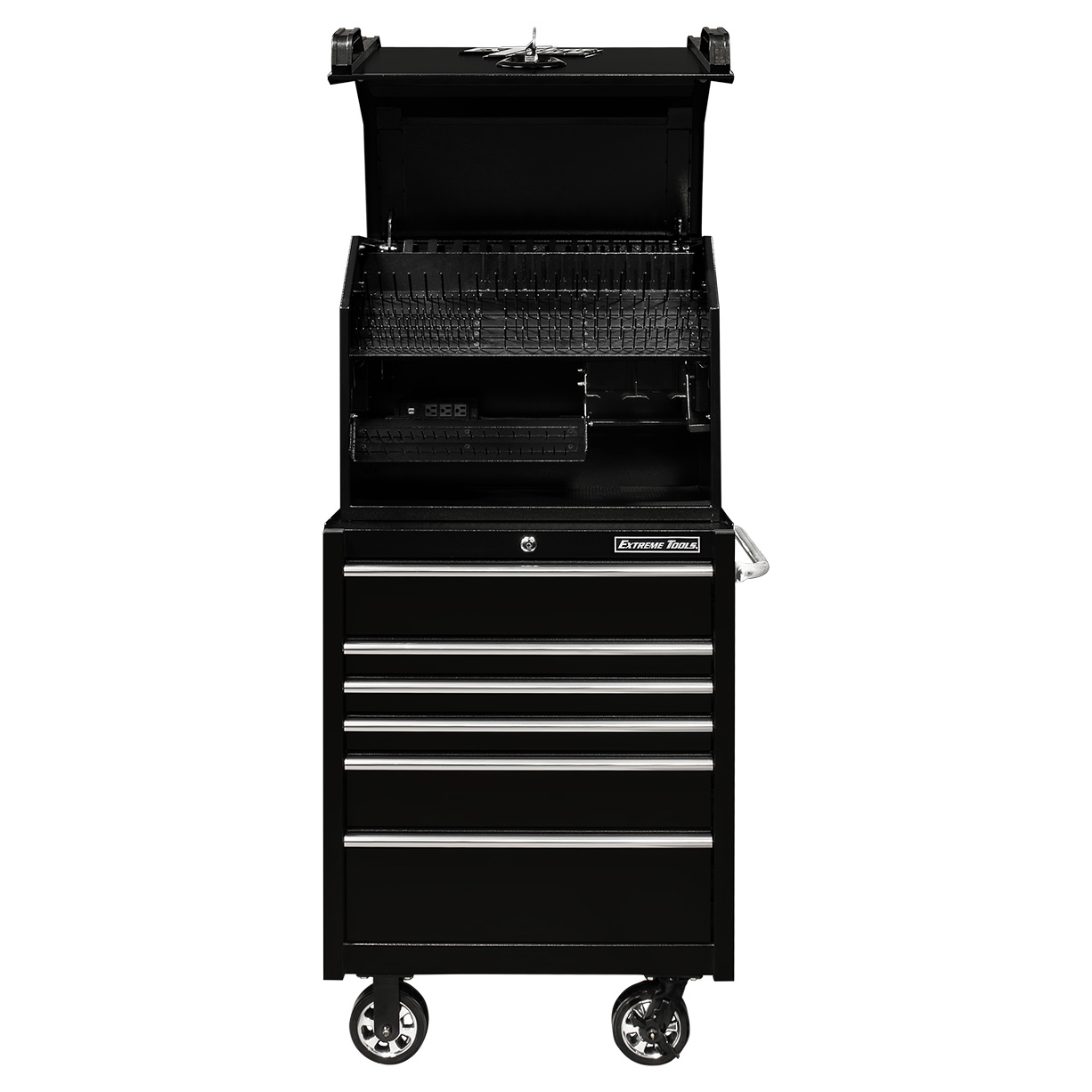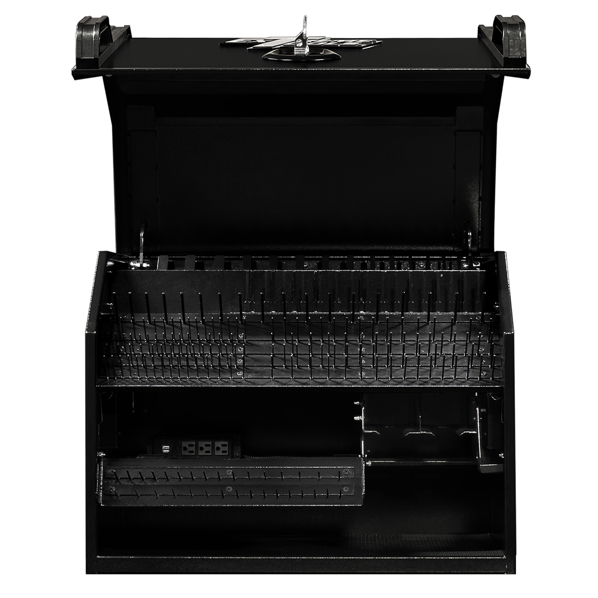 Extreme Portable Workstations® are designed to make your life easier when it comes to keeping track of your tools and storing them. There are pegs, slots, and holders for a variety of hand tools: combination wrenches., screwdrivers, nut drivers, ratchets, extensions, deep & shallow sockets, specialty tools and more… Every square inch of space is utilized in the most efficient way. The socket pegs are attached to panels which lift or to drawer fronts that open to reveal even more storage. Plus, to make them convenient, they are outfitted with a 3-outlet power strip with 2 USB ports and a power tool rack that can hold up to 4 power tools so you can lock it up and keep your power tools charging. The closed, locked lid safely holds the tools in place even if you are traveling with it.