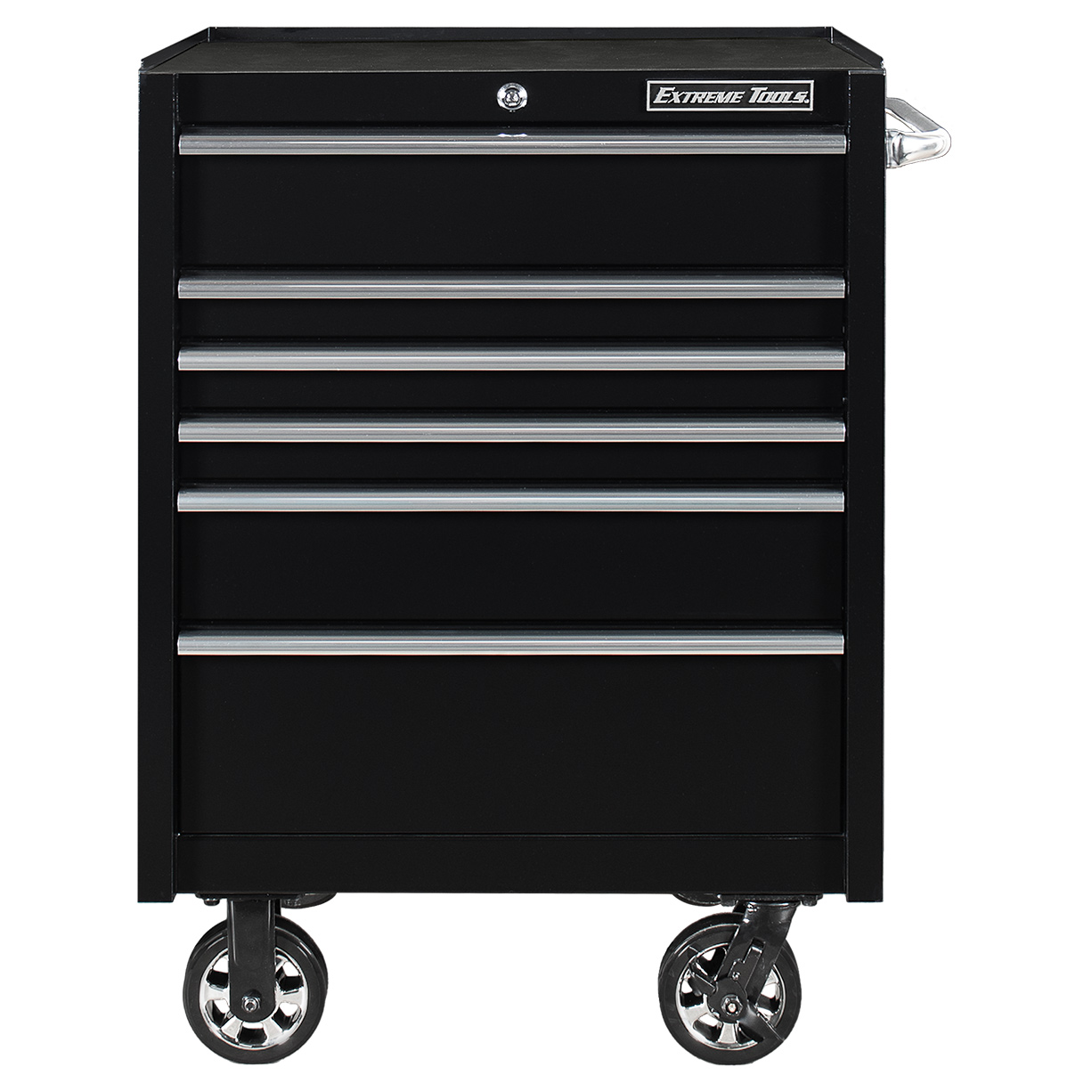 Below the workstation, the 6-drawer roller cabinet provides deep storage for bulkier tools and equipment. The drawers ride on full-extension ball bearing slides and are rated at 100 lbs for single slides and 200 lbs for double slides. Our patented Quick Release self-latching drawer pulls are made from all-metal components for long-term reliability — no plastic parts to break or bend. A tubular lock with coded keys secures the roller cabinet, and four 6-inch casters rated at 900 lbs each support a fully loaded setup.