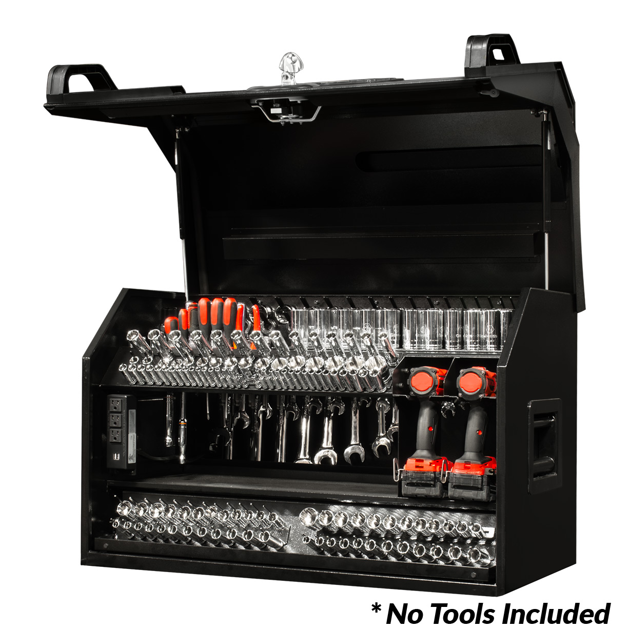 Extreme Portable Workstations® are designed to make your life easier when it comes to keeping track of your tools and storing them. There are pegs, slots, and holders for a variety of hand tools: combination wrenches., screwdrivers, nut drivers, ratchets, extensions, deep & shallow sockets, specialty tools and more… Every square inch of space is utilized in the most efficient way. The socket pegs are attached to panels which lift or to drawer fronts that open to reveal even more storage. Plus, to make them convenient, they are outfitted with a 3-outlet power strip with 2 USB ports and a power tool rack that can hold up to 4 power tools so you can lock it up and keep your power tools charging. The closed, locked lid safely holds the tools in place even if you are traveling with it.