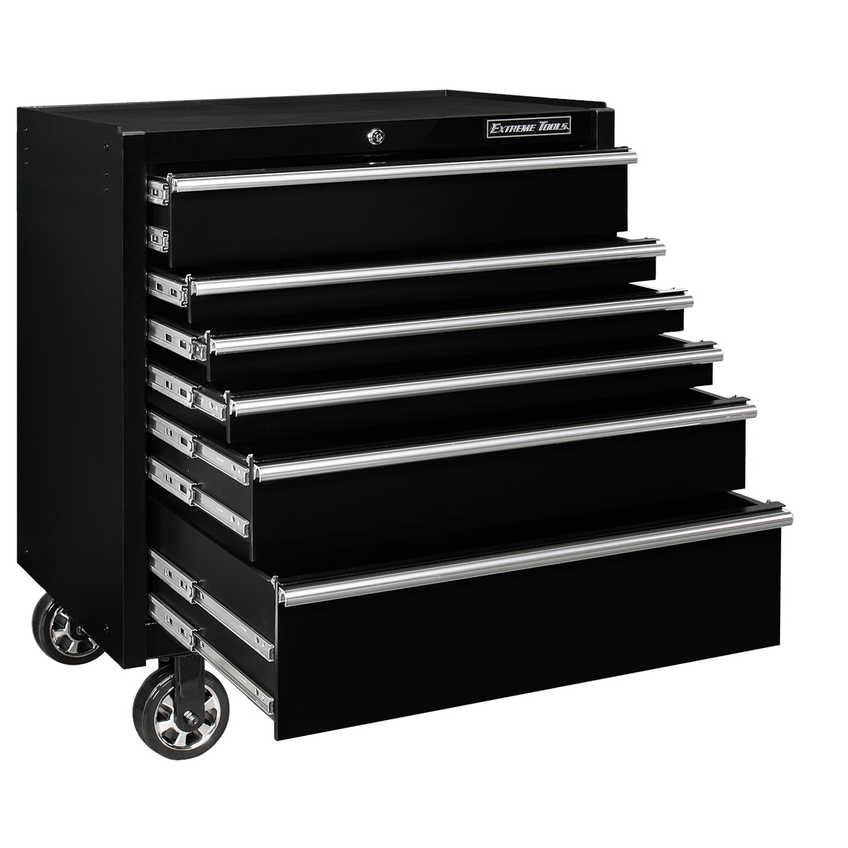 The matching 6-drawer roller cabinet adds deep drawer storage, equipped with full-extension slides rated at 100 or 200 lbs depending on configuration. Our patented Quick Release self-latching drawer pulls are made from solid steel for durability — no plastic parts. A tubular lock system secures the cabinet, and heavy-duty casters (rated at 900 lbs each) provide smooth, stable mobility even under full load.