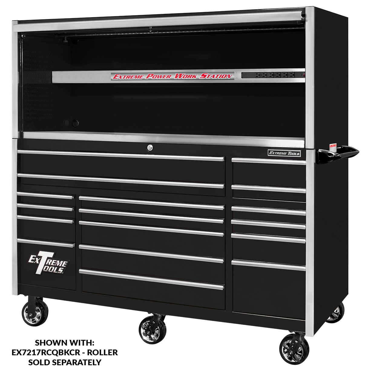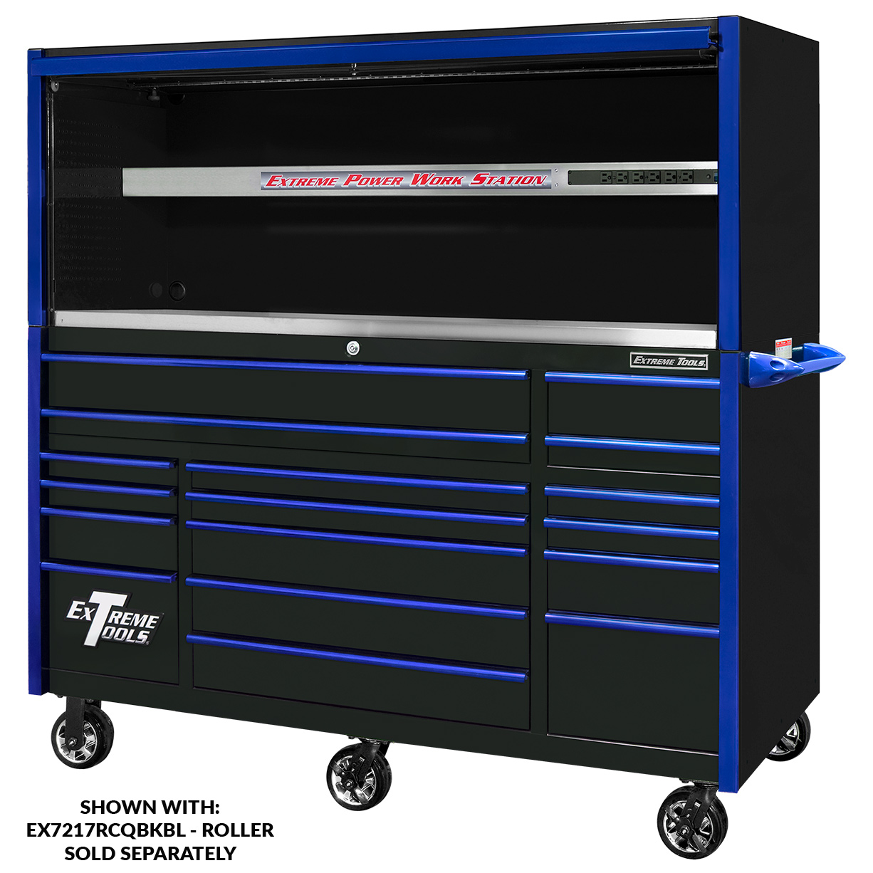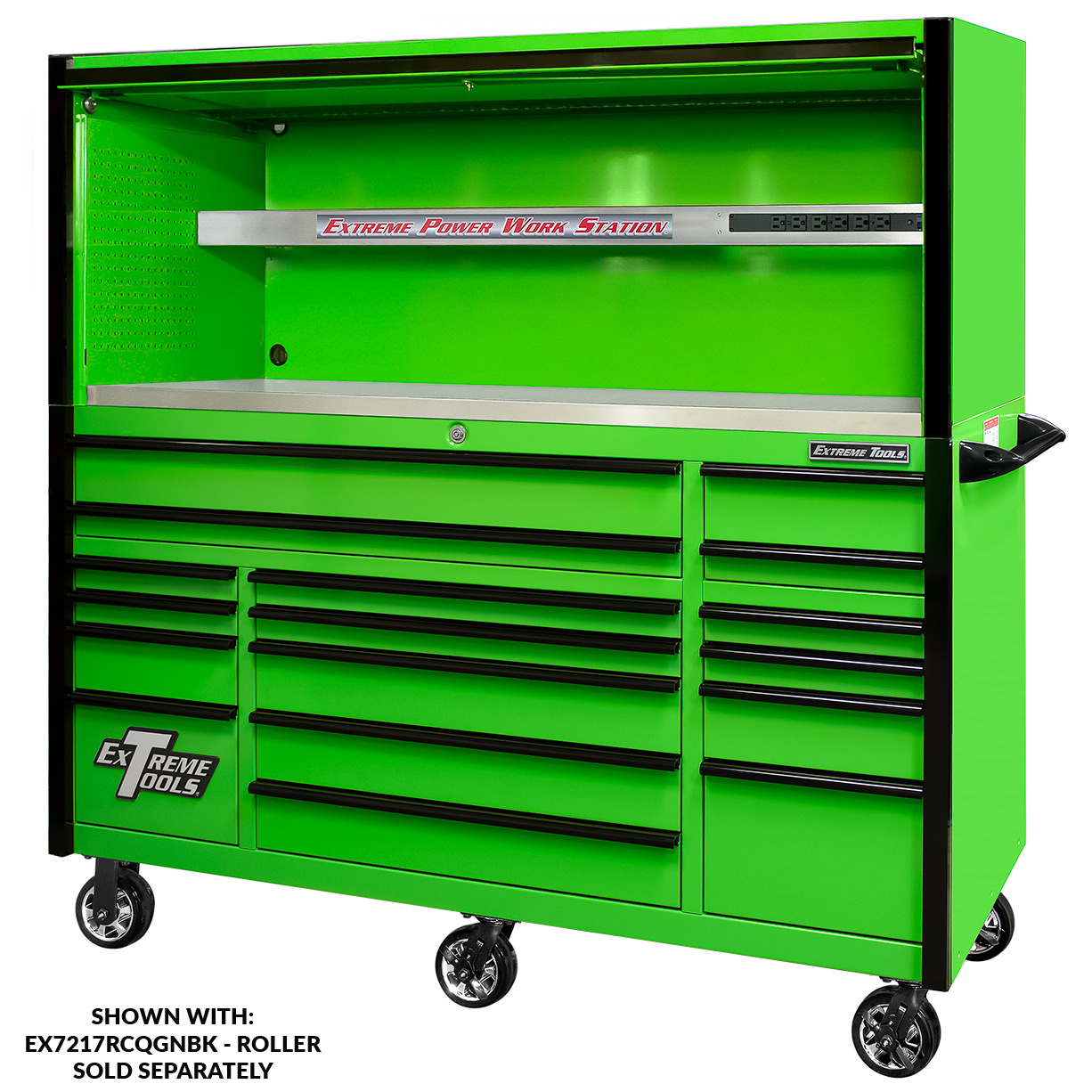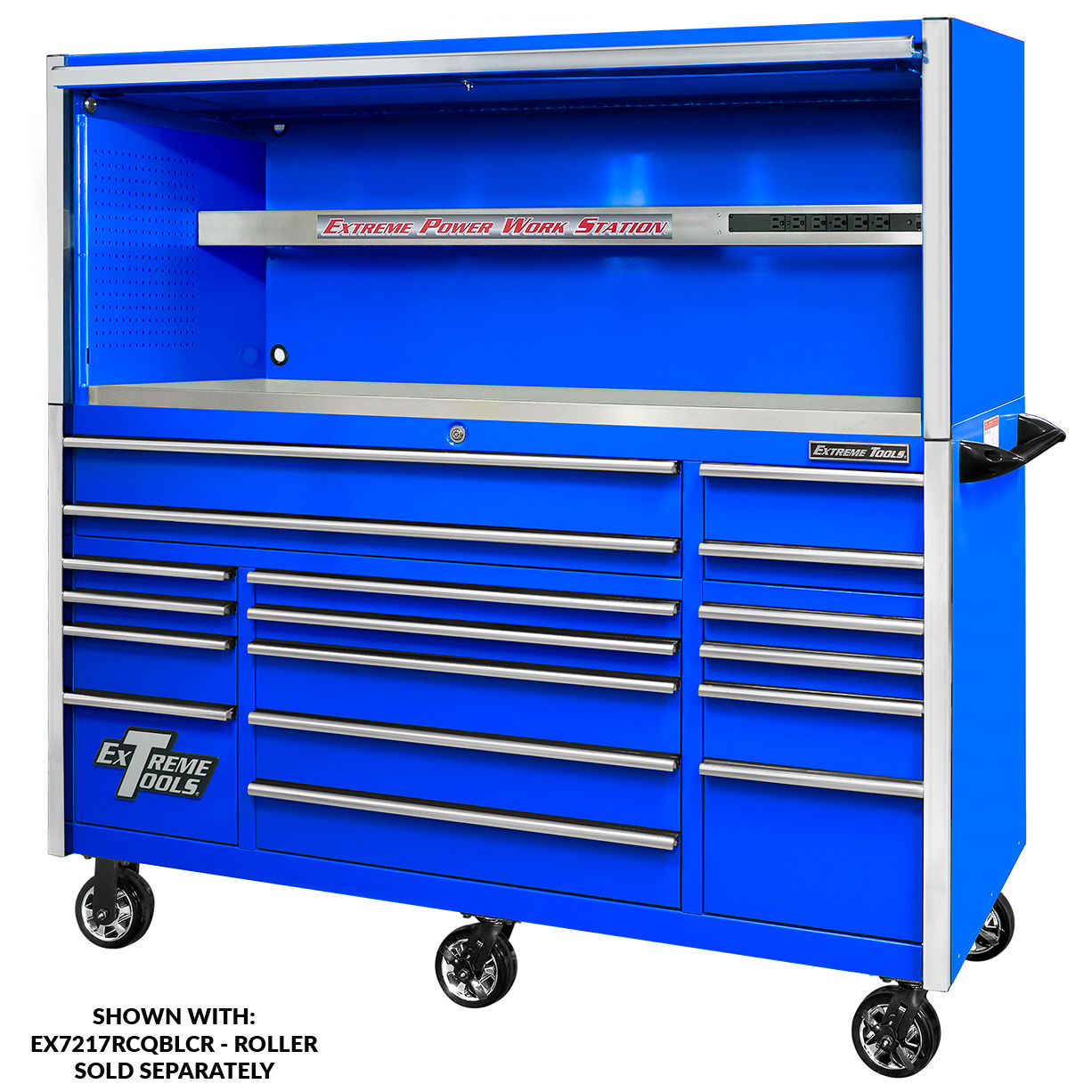 The EX7201HCQ Extreme Tools® 72 Inch Professional Hutch has all the features a professional could possibly want. In short, a full-width, stainless steel top surface, adjustable full-width shelf, and six power outlets. Its design allows it to handle your toughest jobs. Moreover, it gives you the space to charge and operate all your power tools and devices.