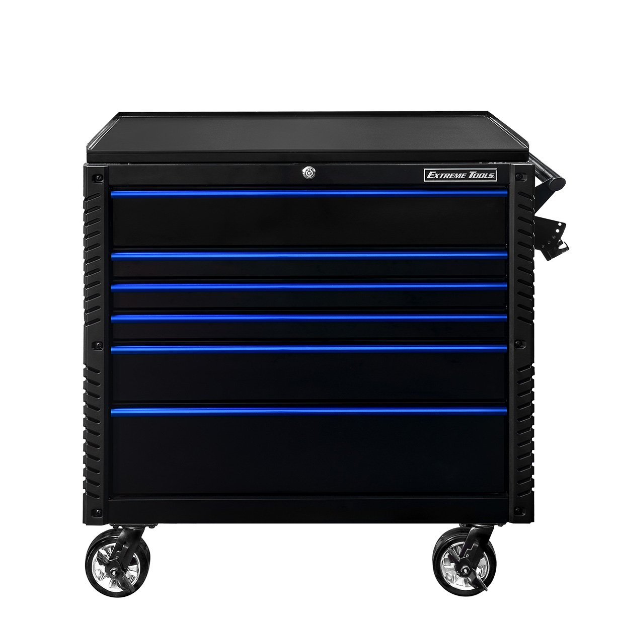 The Extreme Tools® EX Professional Series, 41 inch 6 Drawer Tool Cart is the answer to every mechanic’s wish list. Sure to become a favorite in your workspace, it has a unique design with all kinds of exclusive features you’ll come to rely on — from the bonus power tool rack to the robust impact-resistant corner bumpers.