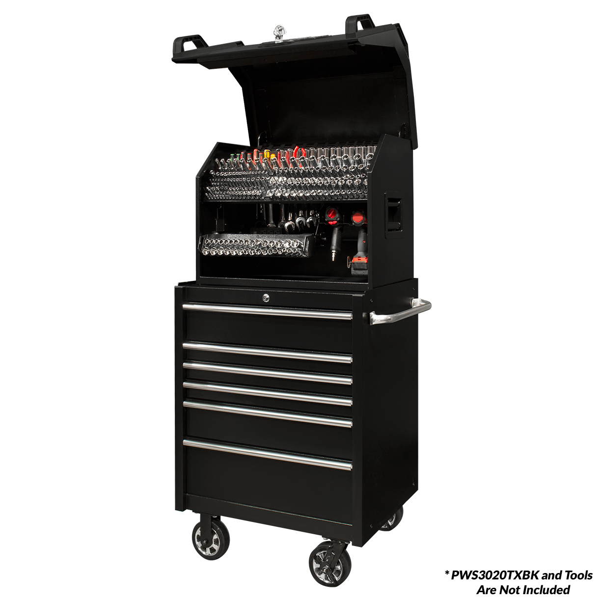 This model includes six full-width drawers, including double-deep and triple-deep drawers for larger tools. Each drawer is equipped with full-extension ball bearing slides, rated at 100 or 200 lbs depending on the depth. The patented PWS Quick Release self-latching drawer pulls keep drawers securely shut and are made from heavy-gauge steel for added strength.