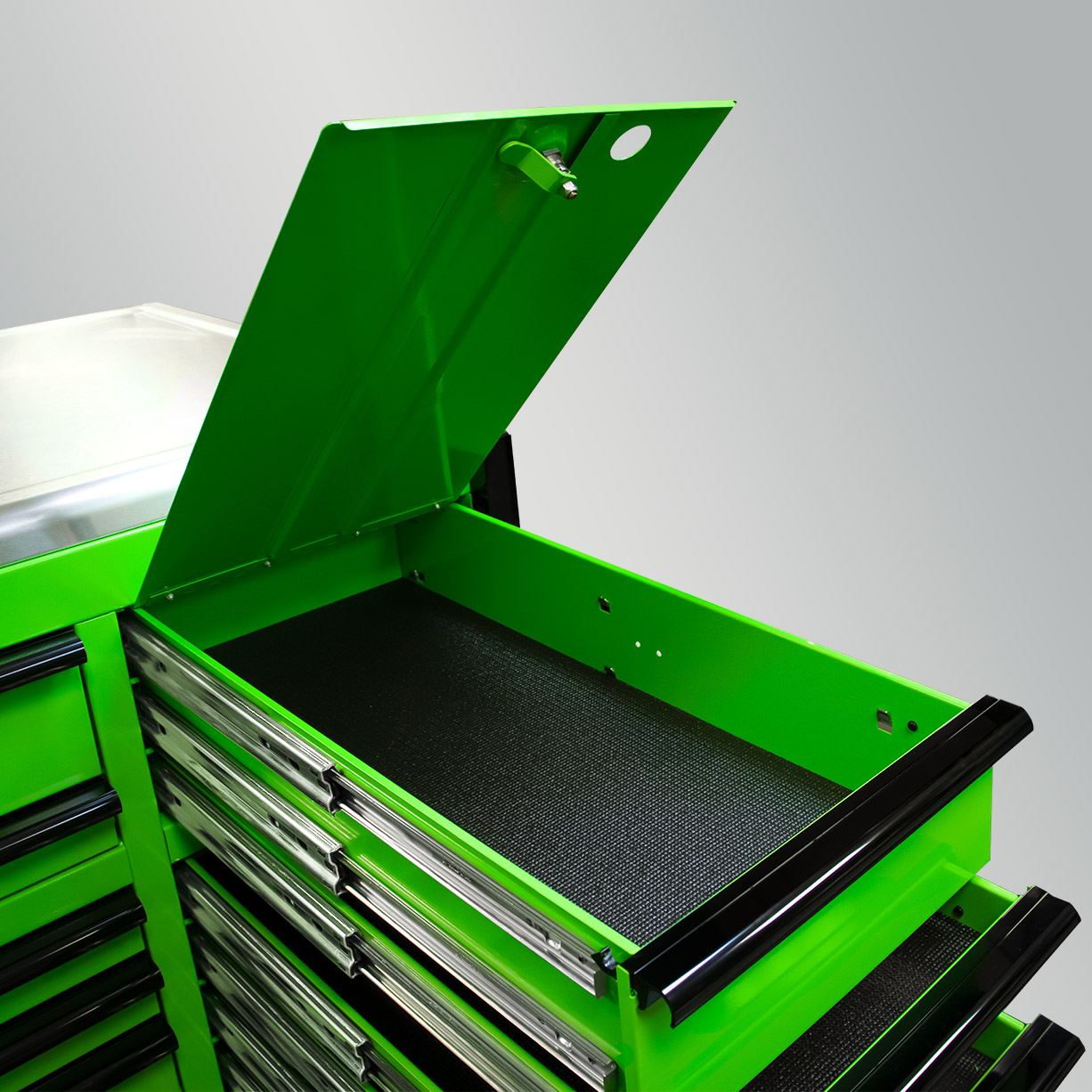 A super strong tool box also needs to look good, so we took care of those details, too! There are no visible spot welds on the drawer fronts, hutch or side cabinet. This means you get a smooth, clean, professional look. We use a specially formulated AkzoNobel powder-coat finish to provide a flawless, high gloss exterior that resists chemicals, scratches and stains. Plus, we use the highest quality extruded, anodized, polished aluminum for drawer pulls that resist oxidation and give the tool box a professional look.