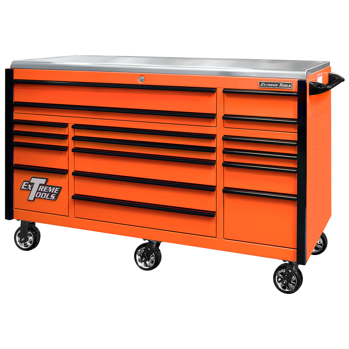 The EX7217RCQ Professional 72 Inch Triple Bank Roller Cabinet is not just about function. It is also about style. This flagship model design will catch your eye with it’s sleek look. Our patented design ensures that you will not see unsightly spot welds on the drawer fronts, hutch or side cabinet. Extreme Tools® includes a professional 304 grade stainless steel work surface that will not yellow like cheaper versions. To accent all these professional features, the EX7217RCQ series offers you a variety of color choices in the cabinet and drawer pull colors. So, you can make it your own to coordinate with your garage or to stand out from anyone else.